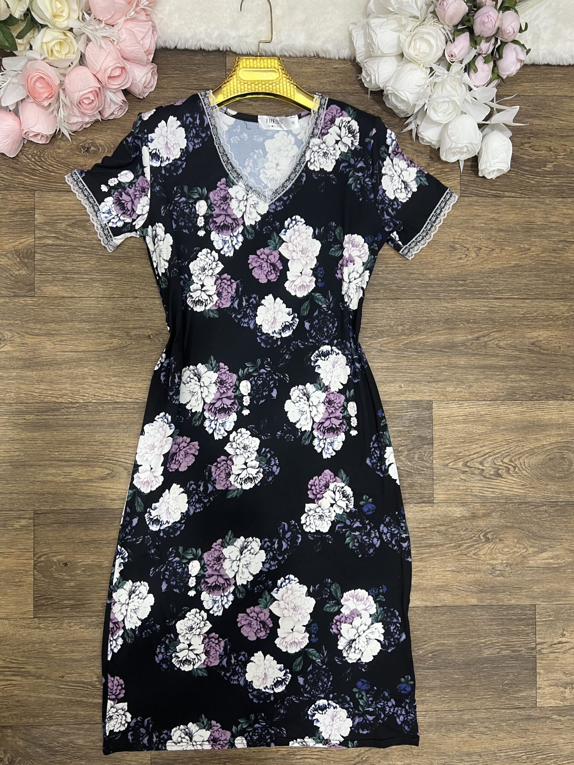 gris fleurs rose